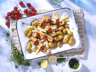 - Fisch und Meeresfrüchte (frisch oder tiefgefroren, z. B. Thunfischsteaks, Lachsfilet-Portionen oder Kabeljau-Rückenfilets)