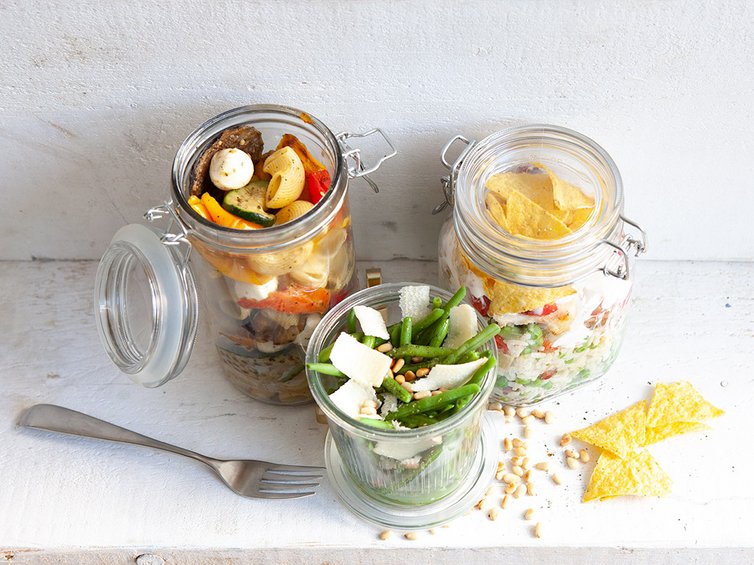 Salate im Glas sind nicht nur praktisch zum Mitnehmen, sondern lassen sich auch ideal im Kühlschrank lagern.