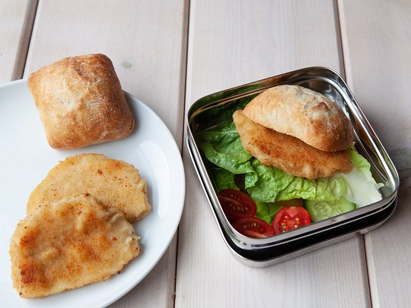 Wir nennen es gerne unser Luxuspausenbrot. Saftige, kleine Wiener Mini-Schnitzel vom Schwein nehmen auf einem Brötchen italienischer Art Platz. Brötchen und Schnitzel bereiten wir abends schon getrennt vor und belegen es dann morgens frisch mit Salat und Tomaten.