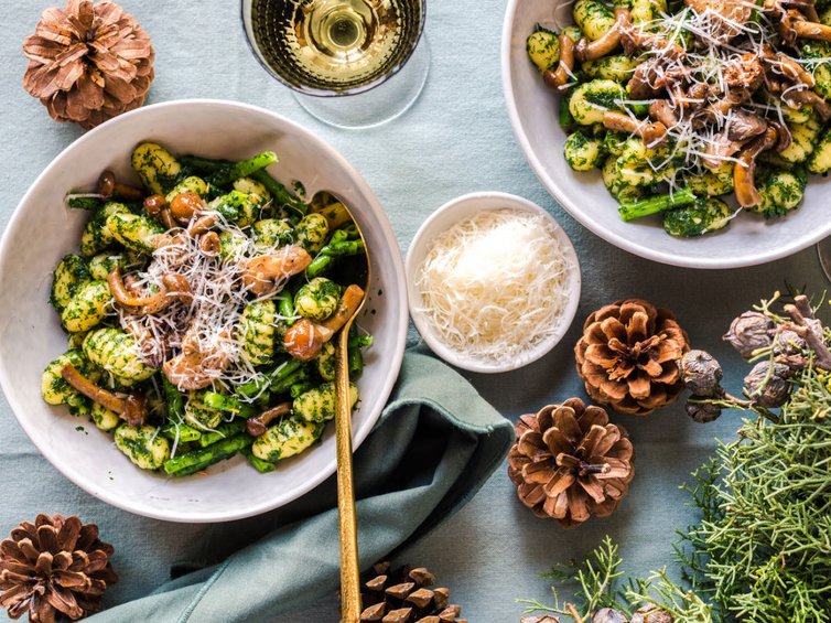 (Bild oben) Für unsere vegetarische Gnocchi-Pilzpfanne mit Bohnen und Pesto muss man sich eigentlich nur am reichhaltigen eismann Sortiment bedienen, denn hier kommt es auf die raffinierte Kombination der Produkte an. Das einzige, was man abseits der eismann Welt benötigt, sind Pinienkerne und etwas Parmesan für das Pesto, daher kann es direkt losgehen mit dem Kochen.