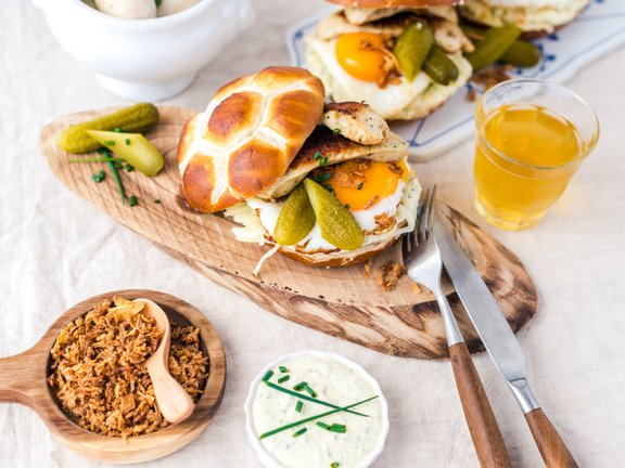 Die eismann Weißwurst, DER bayerische Leckerbissen, wird kurzerhand in einem Burger gestapelt. Hierfür werden die Weißwürste erst ganz klassisch in einer Brühe warm gezogen und im Anschluss kurz in der Pfanne knusprig angerbraten - ganz “burgerlike” eben. Dazu ein Spiegelei, Krautsalat, Röstzwiebeln und eingelegte Gurken. Ein echtes Festessen also. Noch eine Sauce aus Schmand, süßem Senf und Schnittlauch dazu mischen und schon kann bayerisch zugelangt werden. Grundlage für diesen Hamburger sind übrigens die eismann Laugenbrötchen mit gesalzener Butter!