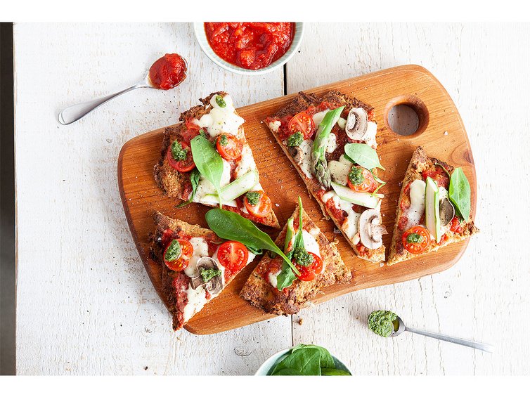 Wer hätte gedacht, dass sich aus Blumenkohl, Mandelmehl und Eiern ein leckerer Pizzaboden herstellen lässt? Tauscht man das Mandelmehl gegen Käse aus, gibt es doppeltes Käsevergnügen. Dieser Boden wird vorgebacken, belegt und dann kurz zu Ende gebacken, damit der Käse oben drauf schmilzt.