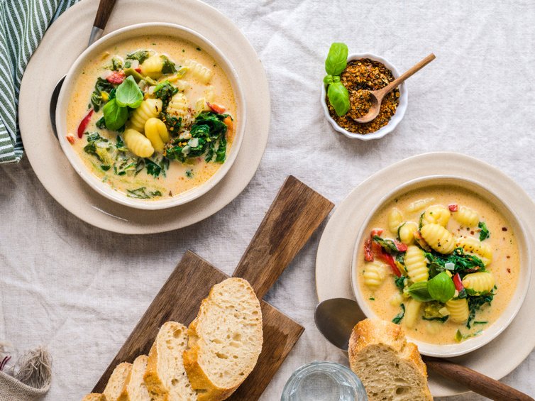 Bei dieser Variante werden Zwiebeln zusammen mit dem eismann Blattspinat Portionen und den vorgeschnittenen Paprikastreifen in einem großen Topf angebraten. Anschließend wird das Ganze mit etwas Geflügelfond und Sahne abgelöscht. Kurz vor dem Servieren kommen dann die eismann Gnocchi dazu und ziehen einfach für ein paar Minuten darin. Danach noch mit etwas Meersalz und groben schwarzen Pfeffer abgeschmeckt und alle können sich auf eine weitere tolle Eintopf-Alternative freuen. Wer es nicht vegetarisch mag, verfeinert diesen italienischen Gnocchi-Eintopf noch mit unserem Bauernseufzern.