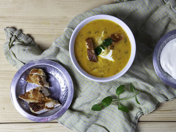 Aus unserer indischen Rote-Linsen-Kokos-Suppe wird im Handumdrehen ein sättigendes Curry. Dafür braten wir unsere gegarten Hähnchenfilet-Spitzen kurz in einer hohen Pfanne, für eine vegetarische Variante eignen sich Paprikastreifen oder anderes Gemüse. Darüber wird die im Wasserbad erhitzte Suppe gegossen und mit Joghurt und Minze verfeinert. Reis oder Naanbrot dazu und genießen!