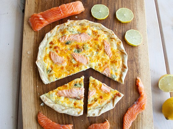 Flammkuchen 4-Käse mit Lachs und Zitrone