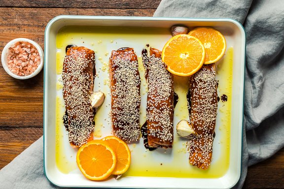 - Das Lachfilet waschen, trocken tupfen und anschließend die Marinade mithilfe eines Backpinsels auf dem Fisch verteilen. Den Sesam darüber streuen und für 15 Minuten in den Backofen geben.