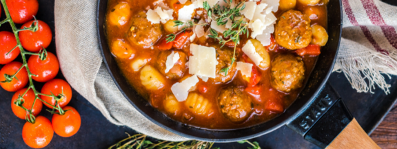 Für unsere Hackbällchen Pfanne a la Toscana vereinen wir unsere eismann Gnocchi (Art.-Nr. 7510) und die eismann Hackbällchen Toskana Art (Art.-Nr. 2462). Wer mag verfeinert das Ganze noch mit ordentlich Parmesan. Die Zubereitung ist einfach. Wir müssen die Hackbällchen einfach in den Vakuumbeuteln erwärmen und geben die Gnocchis anschließend für einige Minuten dazu. Schon steht ein weiterer Gang für den italienischen Abend auf dem Tisch!