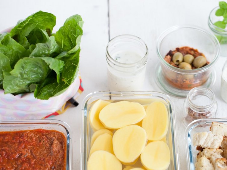 Da wir gleich mehrere Mahlzeiten vorbereiten, können wir auch Dinge parallel erledigen. Ein Rinderschmortopf braucht beispielsweise wenig Hilfe, er schmort im wahrsten Sinne des Wortes vor sich hin. Abgekühlt wartet er im Kühlschrank auf seinen Einsatz. Als Beilage schälen wir Kartoffeln und lagern sie in Wasser bis zum nächsten Tag. Ein Salatkopf wird gewaschen und in einem Beutel im Kühlschrank aufbewahrt, passende Croutons für den Ceasar Salad braten wir an. Auch das Dressing lässt sich hervorragend vorbereiten. Für den schnellen Mittwoch bereiten wir ein Joghurtdressing vor. Aus dem Rinderschmortopf wird eine kleine Portion abgenommen und mit getrockneten Tomaten und Oliven ergänzt. Das wird später eine Sauce für unser Nudelgericht am Donnerstag. Ob wir für Freitag noch eine Suppe vorkochen wollen, oder eine leckere aus dem eismann-Sortiment wählen, hängt von Zeit und Muße ab.