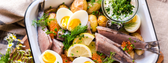 Der Matjes ist ein echter Klassiker, der an den Midsommar Feierlichkeiten, zusammen mit den entzückenden Blumenkränzen nicht fehlen darf. Wir servieren den eismann Matjeshering (Art.-Nr. 6515) mit Kartoffeln, Dill, Forellenkaviar und roten Zwiebeln. Die Matjes Kartoffeln können sowohl kalt, als auch warm genossen werden. Eine echte Abwechslung auf der Festtafel.