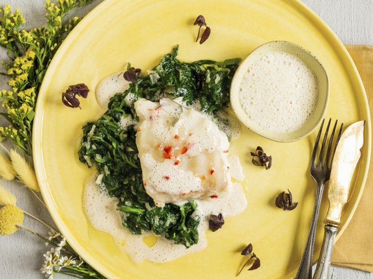 Hauptgang: Leng mit weißer Fisch-Butter-Sauce auf Blattspinat