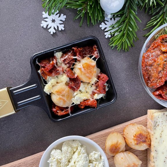 Wer sich an den Festtagen etwas gönnen möchte und Fisch mag, für den ist unser Pfännchen mit Jacobsmuscheln genau das richtige: Jacobsmuscheln (Art.-Nr. 8211), getrocknete Softtomaten, Kräuter-Crème-fraiche und natürlich Käse.