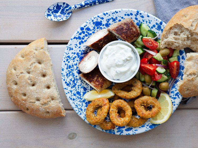 Aus Essig, Öl, Salz, Pfeffer und 10 El Wasser rühren wir das Dressing zusammen. Das Gemüse und die Minze schneiden wir klein und geben sie zum Dressing hinzu. Den Salat lassen wir kurz ziehen, damit sich die Aromen voll entfalten können. Nach Wunsch geben wir jetzt den Schafskäse auf den Salat. Während das Tsatziki und der Salat ziehen, bereiten wir die die Calamares und das Fladenbrot nacheinander im Backofen zu und braten die Hackröllchen in der Pfanne an.