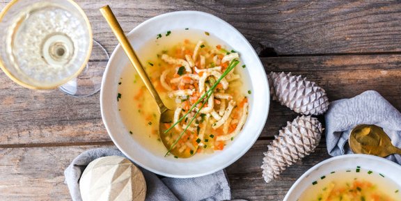 Für den ersten Gang, unserer Festtagssuppe, kommen unsere liebsten Zutaten zusammen. In unserer klaren eismann Delikatess-Suppe wird Bouillon-Gemüse, zusammen mit den eismann Frittaten und einem Hauch von Schnittlauch erwärmt. Lassen sie die Brühe einfach bei mittlerer Hitze für 15 Minuten auf dem Herd und schon steht dem Genuss des ersten Ganges nichts mehr im Wege!