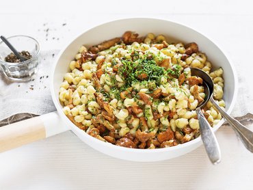 Frische Pfifferlinge schmecken besonders lecker – keine Frage. Doch außerhalb der Saison oder wenn du nicht zu den Pilzsammler:innen gehörst, kannst du für deine Rezepte auch gern zu tiefgekühlten Pfifferlingen greifen. Da sie kurze Zeit nach dem Sammeln schockgefrostet wurden, sind bei ihnen ein Großteil der Vitamine noch erhalten – im Gegensatz zu anders haltbar gemachten Pfifferlingen. Gefrorene Pilze kannst du einfach aus der Verpackung entnehmen – und zwar genau in der Menge, die du für dein Rezept benötigst – und ohne Auftauen direkt in dein Gericht geben. Zudem entfallen hier das mitunter zeitaufwändige Suchen und auch das lästige Putzen.