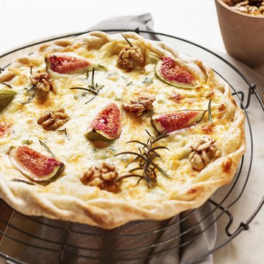 Unser dünner Flammkuchenteig wird mit einem geflochtenen Rand für die appetitliche Optik angeboten und saftig mit Crème fraîche und vier unterschiedlichen Käsesorten belegt. Fein würziger Blauschimmelkäse, typischer Emmentaler, milder Cheddar und Mozzarella geben dem Flammkuchen den unvergleichlichen würzigen Geschmack.