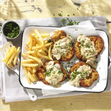 Saftiges Schweinefleisch deutscher Herkunft, aus dem Mittelstück geschnitten, erhält durch unsere flüssige Würze geschmackliche Verfeinerung. Die feine Panade sorgt für den knusprigen Genuss. Wie vielseitig unsere köstlichen Wiener Schnitzel vom Schwein sind, beweist Du mit unseren tollen Rezeptideen zur Schnitzelparty auf eismann.de.