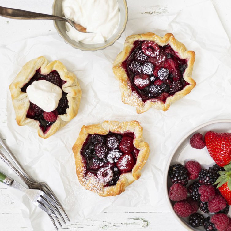 Den Rand um die Früchte hochziehen und die Törtchen auf ein mit Backpapier ausgelegtes Backblech setzen. Auf mittlerer Schiene ca. 20 Minuten backen.