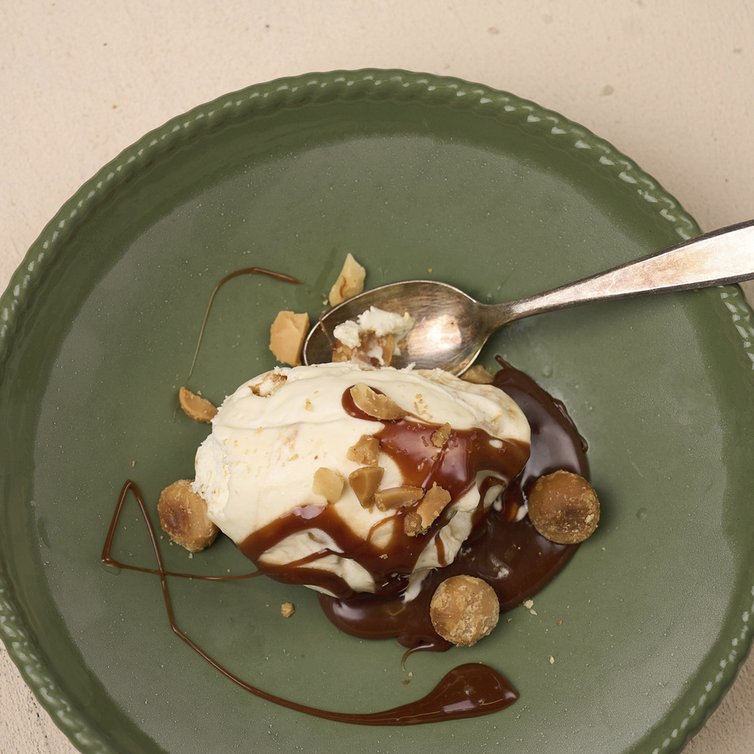 BIO Macadamia Crunch Eis mit Karamellsauce und gerösteten Macadamianüssen