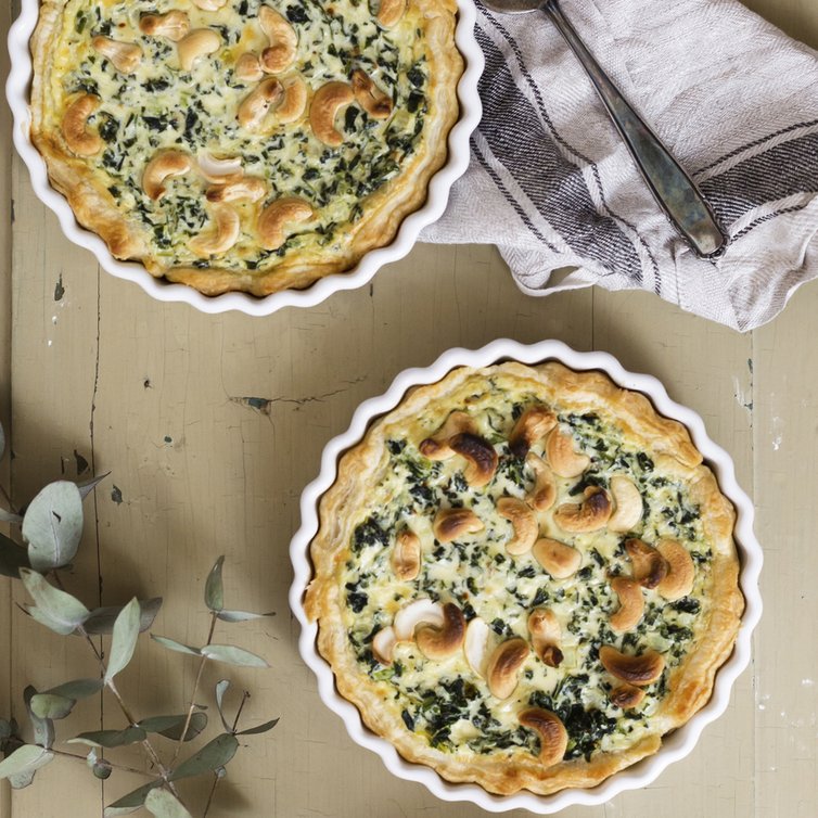 Die Quicheform nach den 15 Minuten aus dem Ofen nehmen, die Grünkohl-Eiermasse hineinfüllen und den restlichen Ziegenkäse auf dem Guss mit den Cashewnüssen verteilen und erneut ca. 20 Minuten im Ofen backen.