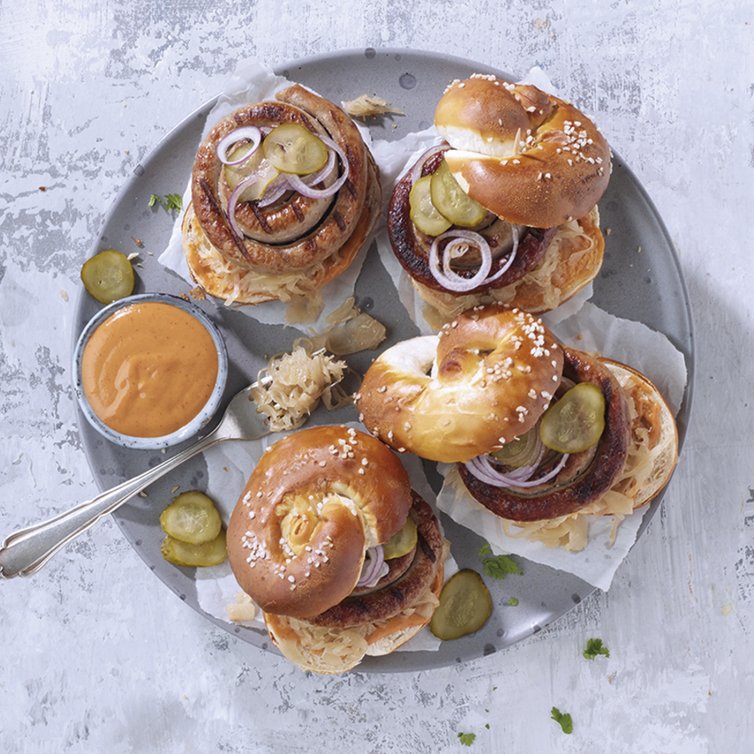 Jetzt geht es ans Belegen: Die unteren Hälften der Laugenknoten mit der Burger Sauce bestreichen. Apfelsauerkraut darauf verteilen, gegrillte Bratwurstschnecke aufs Kraut setzen und mit Gurkenscheiben und Zwiebelringen belegen. Schließlich die obere Hälfte vom Laugenknoten daraufsetzen.