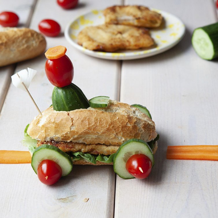 Aus vier weiteren Zahnstochern werden dann die Reifen gebastelt. Dafür eine Gurkenscheibe mit einer halben Tomate, an der passenden Stelle, in das Brötchen stecken.