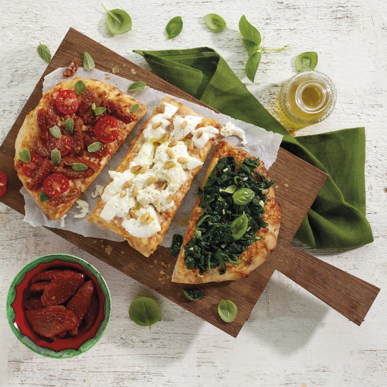 Die aus dem Ofen kommende Pinsa in breite Streifen schneiden. Die einzelnen Stücke unterschiedlich belegen: Gedünsteten Spinat großzügig verteilen, mit Basilikumblättern garnieren und mit Olivenöl beträufeln. Büffelmozzarella auf anderen Teilen der Pinsa gleichmäßig verteilen, großzügig mit gerösteten Pinienkernen bestreuen und ebenfalls mit Olivenöl beträufeln. Für den roten Belag die Kirschtomatenhälften und die feinen getrockneten Tomatenstreifen gleichmäßig verteilen. Oregano Blättchen darüber streuen, mit Olivenöl beträufeln und nach Geschmack mit Salz und Pfeffer würzen.