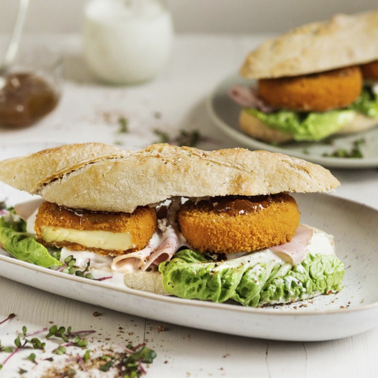 Baguette halbieren, aufschneiden und füllen mit einem Salatblatt, Kochschinken, etwas Béchamelsauce. Darauf den heißen gebackenen Camembert setzten, mit Béchamelsauce und dunkler Feigenmarmelade toppen und genießen.