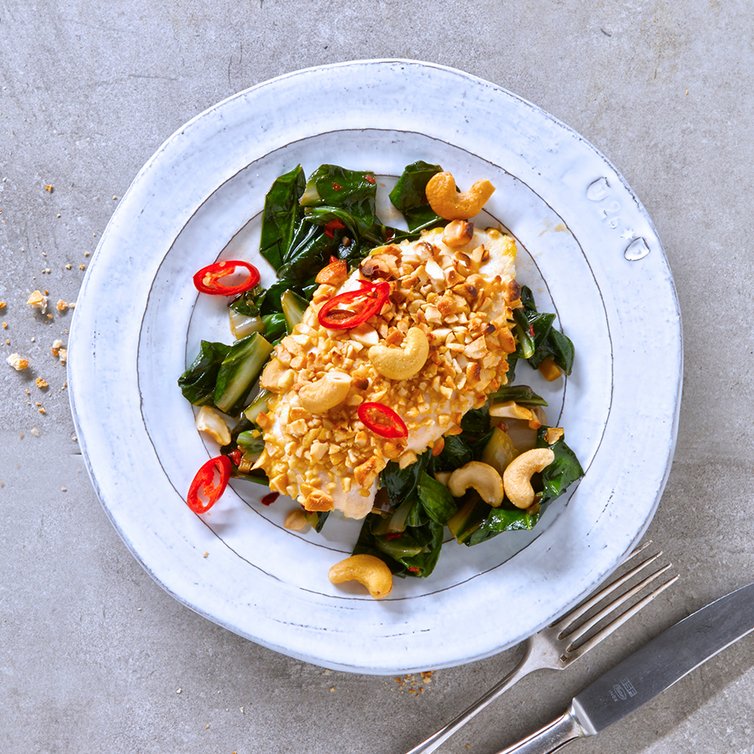 Den Backofen auf 200°C vorheizen. Ein Backblech mit Backpapier bereitstellen. Das Ei verquirlen und die aufgetauten und trocken getupften Hähnchenbrüste durch das Ei ziehen. Dann von einer Seite auf die Cashewnüsse legen und fest andrücken. Das Fleisch mit den Nüssen nach oben auf das Backblech legen und für ca. 12-15 Minuten im Ofen garen.