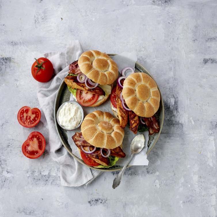 Die untere Hälfte des Dinkelbrötchens mit Sardellen-Mayo bestreichen und mit Salatblatt und Tomatenscheiben belegen. Je zwei Hähnchenbrustfilets daraufsetzen und mit etwas Mayo beträufeln. Zwiebelringe und Bacon darauf verteilen und mit der oberen Hälfte des Brötchens verschließen.