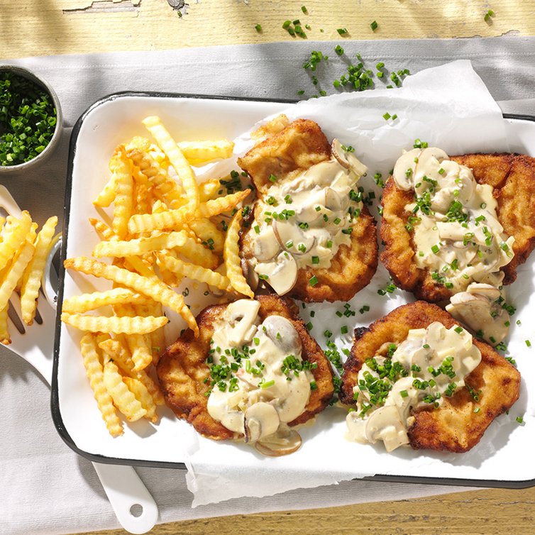 Schnitzel mit Champignonrahmsauce auf Tellern anrichten und servieren.