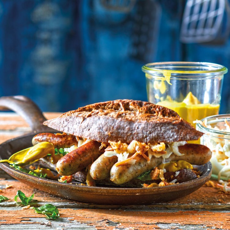 Die Brötchen aufschneiden, die Unterseite dünn mit Senf bestreichen und mit Salatblättern belegen. Auf den Salat jeweils 4 Würstchen pro Burger geben, dann den Coleslaw auf den Würstchen verteilen, mit Röstwiebeln dekorieren und den Brötchendeckel auflegen.