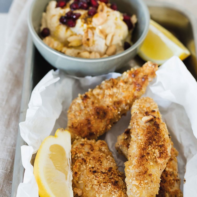 Crunchy Erdnuss-Hähnchen mit Hummusdip