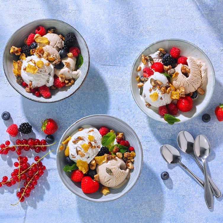 Zum Servieren in die Eisgläser eine paar Flakes und auch etwas Nussmischung hineingeben. Dann jeweils eine Kugel Haselnuss und Walnuss darauf geben und mit den Beeren, den restlichen Nüssen und den Flakes dekorieren.