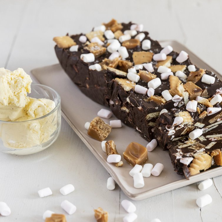 Dünne Schicht geschmolzene Schokoladenmasse in die ausgekleidete Form gießen. Keksbruch, Marshmallows, Macadamiabruch und gehakte Kuhbonbons auf die Schokoladenschicht legen, dabei einen schmalen Rand freilassen. Füllung mit etwas Schokolade beträufeln und Schicht für Schicht abwechselnd trockene Zutaten und Schokomischung in die Kastenform geben. Form mit überhängender Folie abdecken und für mindestens 5 Stunden im Kühlschrank aushärten lassen.
