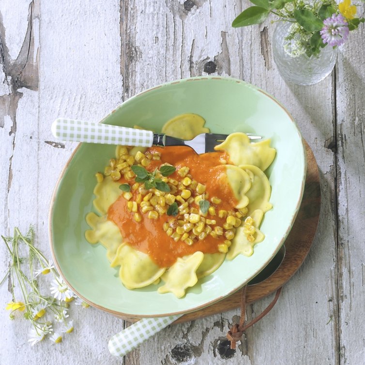 Die Nudeln abgießen und in die Tomatensauce geben. Vorsichtig unterheben und auf die Teller verteilen. Mit geröstetem Mais bestreuen und servieren.