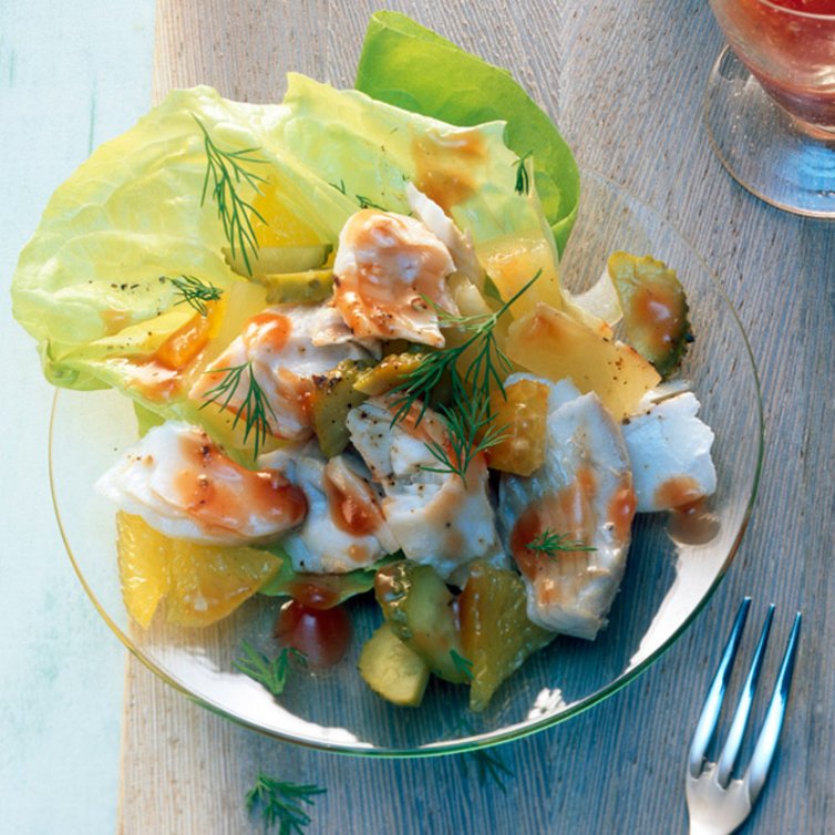 Bekannte Salate mit Hühnchen oder Streifen der Entenbrust kennen viele. Gerade im Sommer ist ein fruchtiger Salat mit Seelachsfilet und Orange eine leichte und raffinierte Alternative.