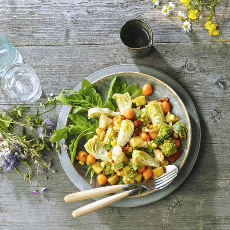 Für das Dressing übriges Öl und Essig verrühren und mit Salz und Pfeffer würzen. Gemüse-Kartoffelpfanne und Mais sowie Tomaten und Artischockenherzen noch warm mit dem Dressing vermischen und kurze Zeit durchziehen lassen.