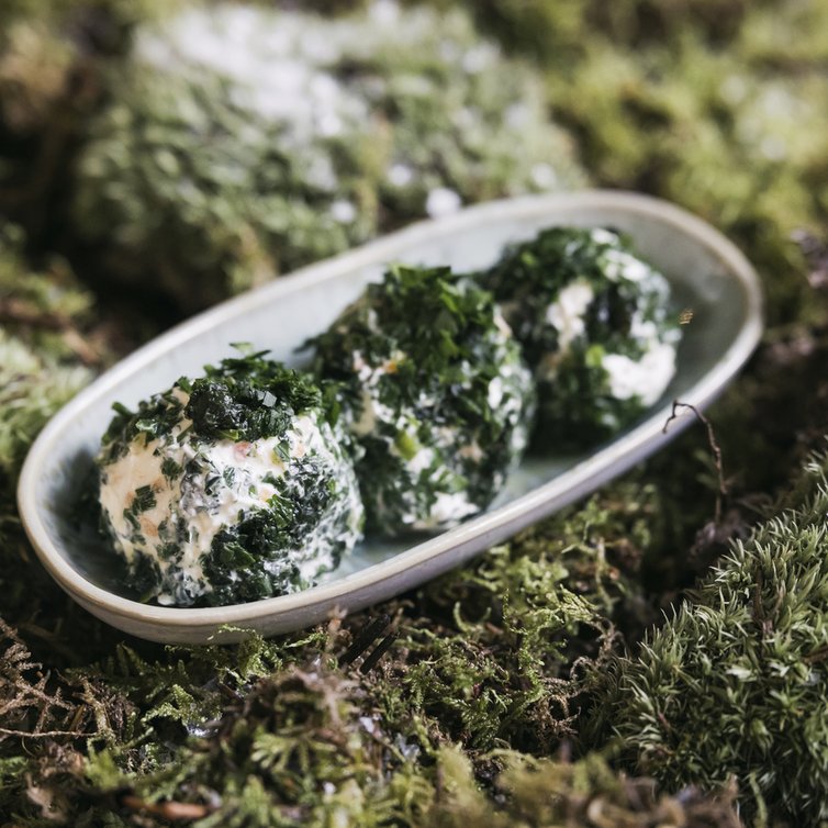 Frischkäse mit abgeriebener Zitronenschale und Prise Salz vorsichtig vermengen und aus der Masse kleine Bällchen formen. Anschließend in den Kräutern wälzen.