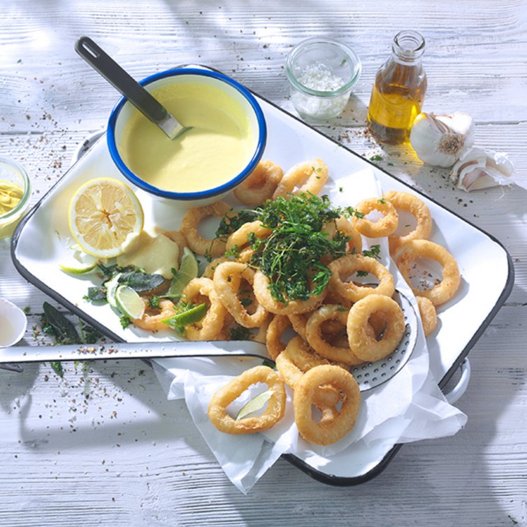 Nun die Fritteuse auf 180°C aufheizen. Die Calamares à la Romana portionsweise in den Fritteusen-Korb legen und ca. 5 Minuten kross backen. Auf Küchenkrepp abtropfen lassen.