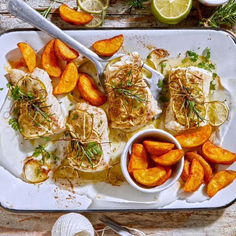 Die Kabeljau-Rückenfilets auftauen lassen und trocken tupfen. Den Backofen auf 180° C Ober-und Unterhitze vorheizen.