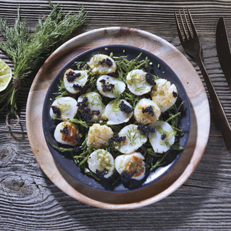 In einer weiteren Pfanne die Salicorne in Butter kurz anbraten, mit frischem Pfeffer und Limettensaft würzen. Anschließend auf einer Platte anrichten.