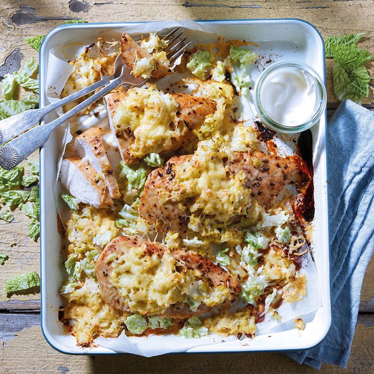 Währenddessen eine Auflaufform ausfetten. Den Wirsingkohl hinein geben, die Putenschitzel darauf legen und mit geriebenem Emmentaler bestreuen.