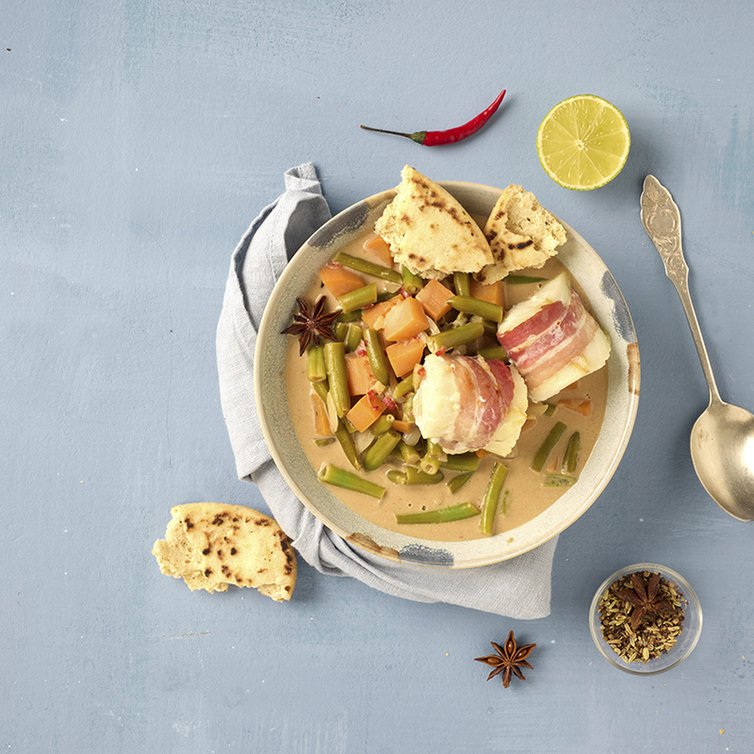 Eine Pfanne erhitzen. Den Kabeljau aus dem Ofen nehmen und in etwas Olivenöl kurz anbraten, bis der Bacon schön kross ist. Die Kabeljau-Rückenfilets anschließend auf das Curry setzen und nach Belieben mit etwas Brot servieren.