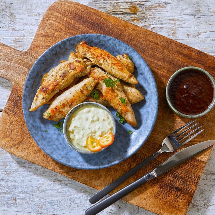 Hähnchen-Innenfilets mit Dips anrichten. Die Dips nach Wunsch mit Chilifäden und Physalis garnieren und servieren.