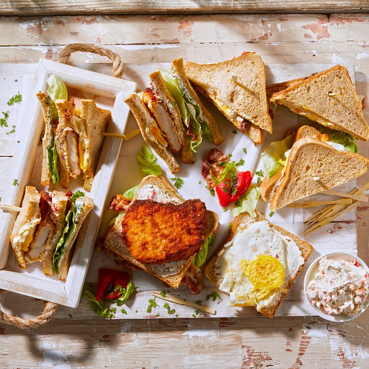 Eier aufschlagen und in erhitzter Butter zu Spiegeleiern braten. Sandwiches wie folgt belegen: Brotscheiben mit Kräuterfrischkäse, Salat, Bacon, Brotscheiben mit Paprikafrischkäse, Hähnchenschnitzel, Spiegelei, und mit den übrigen Brotscheiben abdecken. Sandwiches diagonal halbieren, evtl. mit Holzspießen fixieren und zum Mitnehmen verpacken.