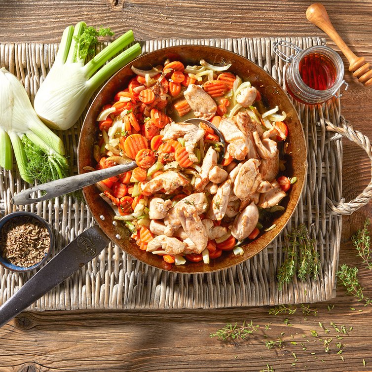 Orangensaft und Balsamicoessig zufügen und das Gemüse abgedeckt ca. 10 Minuten garen. Gemüse mit Fenchelsamen, Thymian, Honig und Senf verfeinern und mit Salz und Pfeffer abschmecken. Hähnchenbrust wieder dazugeben, kurz mit erhitzen und servieren.