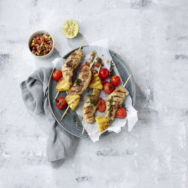 Hähnchenspieße mit gegrillter Ananas-Salsa und Coctailtomaten.