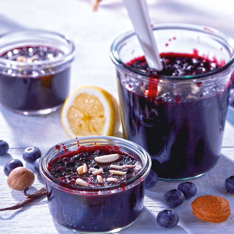 Die Heidelbeeren mit den Gewürzen zusammen in einem großen, hohen Topf komplett auftauen lassen. Dann den Gelierzucker, die Mandelsplitter und den Zitronensaft dazu geben und erhitzen. Ca. 4 Minuten sprudelnd kochen lassen.