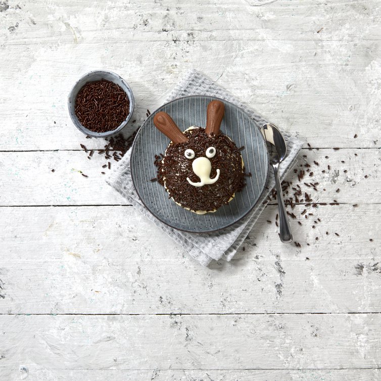 Zuckeraugen aufsetzen und Katzenzungen für Hasenohren vorsichtig ins Eis stecken.