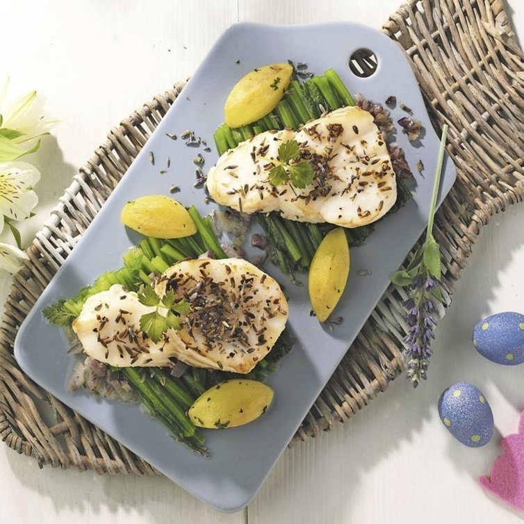 Kabeljaufilet mit Lavendel-Pfeffer auf Bohnenbett